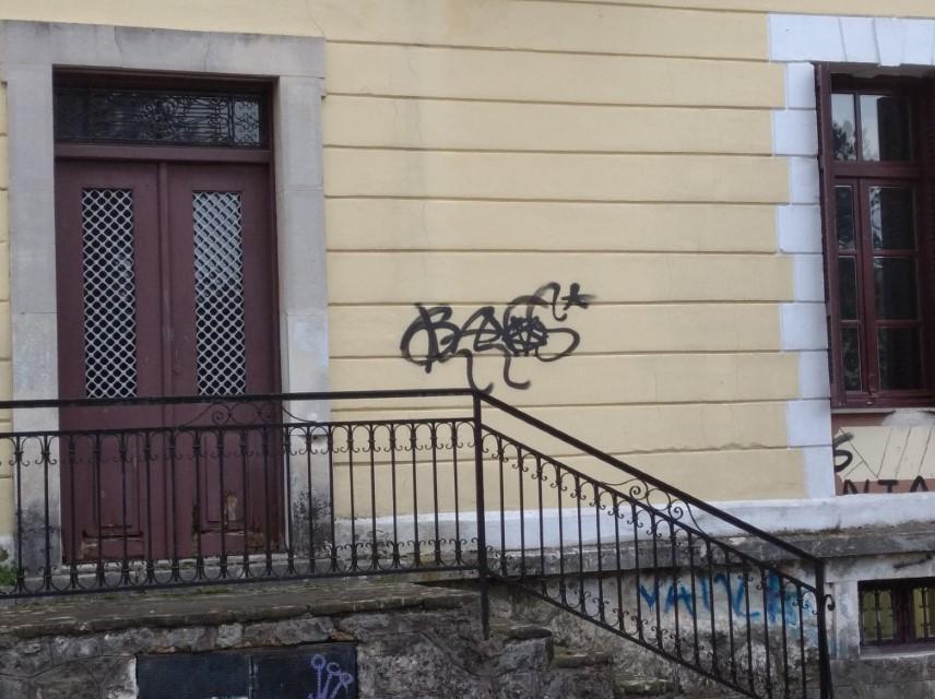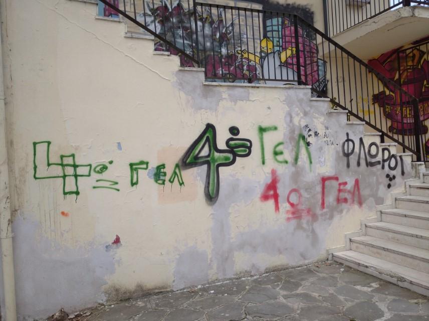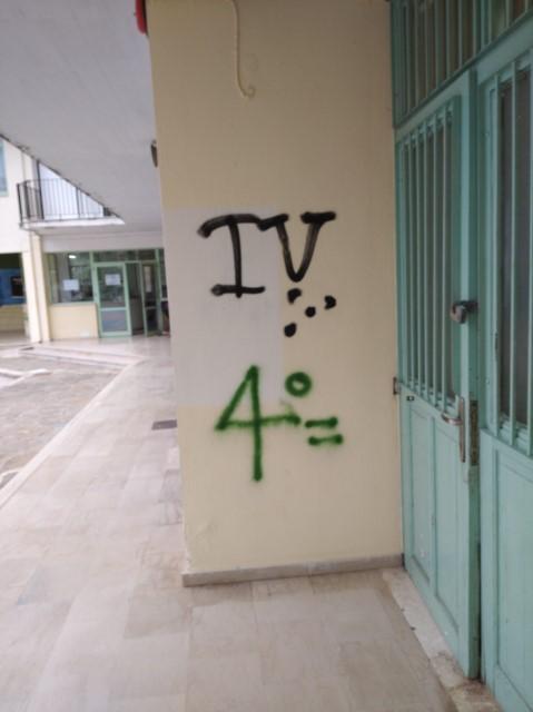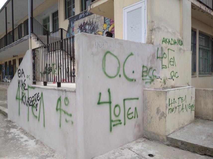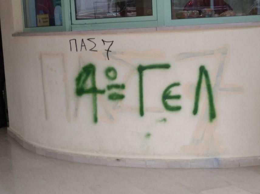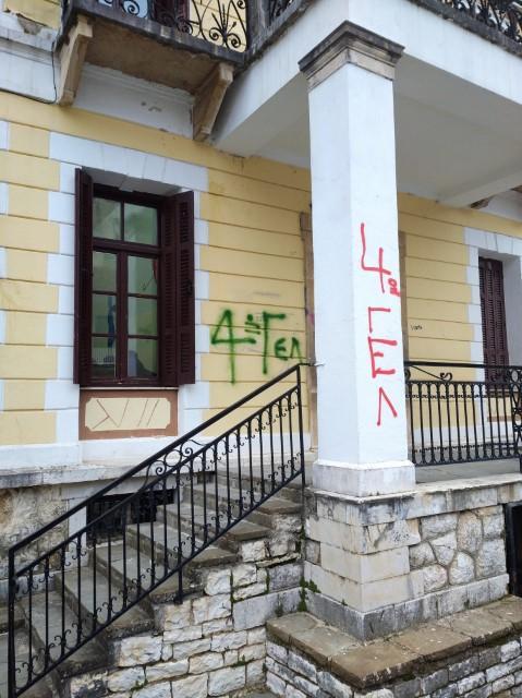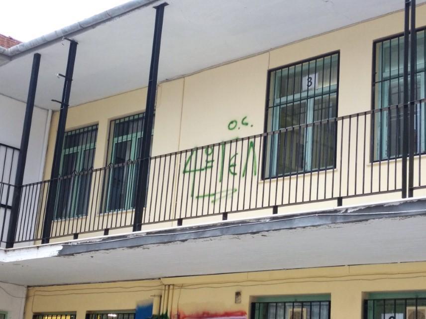Ενόψει ενός ποδοσφαιρικού μαθητικού αγώνα μεταξύ των δύο σχολείων, που διεξήχθη τη Δευτέρα που μας πέρασε, λίγο πριν τις 11 τη νύχτα της Παρασκευής (ούτε καν δηλαδή μετά τα μεσάνυχτα, σε μια άδεια πόλη, εν κρυπτώ και παραβύστω) τα κτήρια του 7ου Λυκείου βανδαλίστηκαν, γέμισαν μουντζούρες, συνθήματα κ.ο.κ. Από τη μανία των βανδαλιστών δεν γλύτωσε φυσικά ούτε το παλιό νεοκλασικό που στέγαζε την Εμπορική Σχολή.