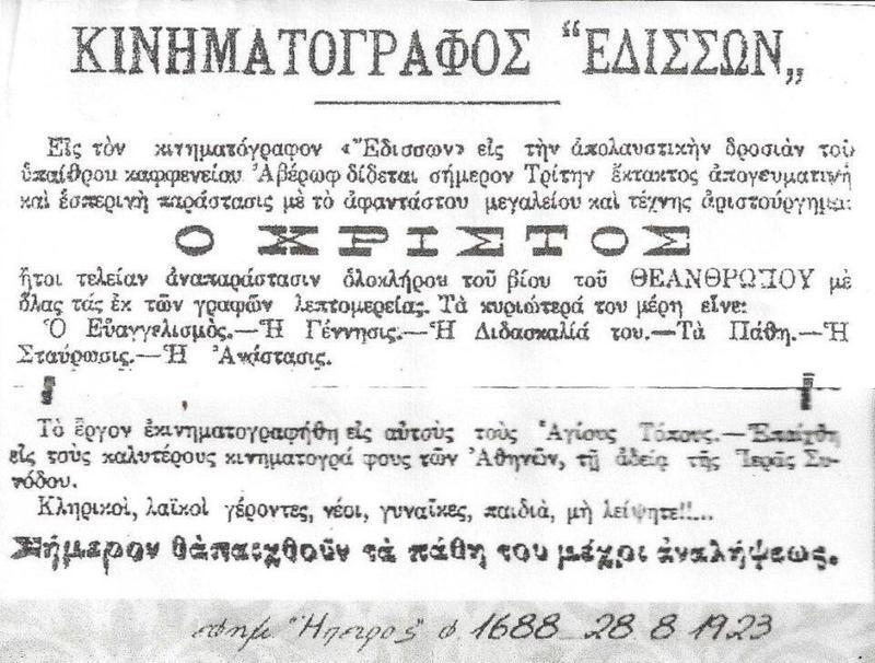 Αξίζει, επίσης, να σημειωθεί ότι και στο παραπάνω καφενείο «Αβέρωφ» (από τα μεγαλύτερα της πόλης και από τα πρώτα που έβαλαν ηλεκτρικό φωτισμό λίγο μετά την απελευθέρωση), πριν τη μεταφορά του κινηματογράφου «Εδισσων», γινόταν κινηματογραφικές προβολές στον κήπο του. Αποκλειστικός τρόπος της αναγγελίας και διαφήμισης των κινηματογραφικών ταινιών που προβάλλονταν, ήταν οι εφημερίδες.